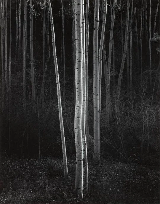 Adams was driving along the highway through the mountains with his wife and two assistants when they came across this stand of Aspens in mellow golden autumn tints. All three photographers busied themselves looking for their visions, Adams on this occasion was working with the largest of the cameras he routinely used, the 8 x 10 inch plate camera. In both images, great pains were taken to ensure that there were no areas of sky in the composition that would would have been the brightest areas in the scene and very distracting.