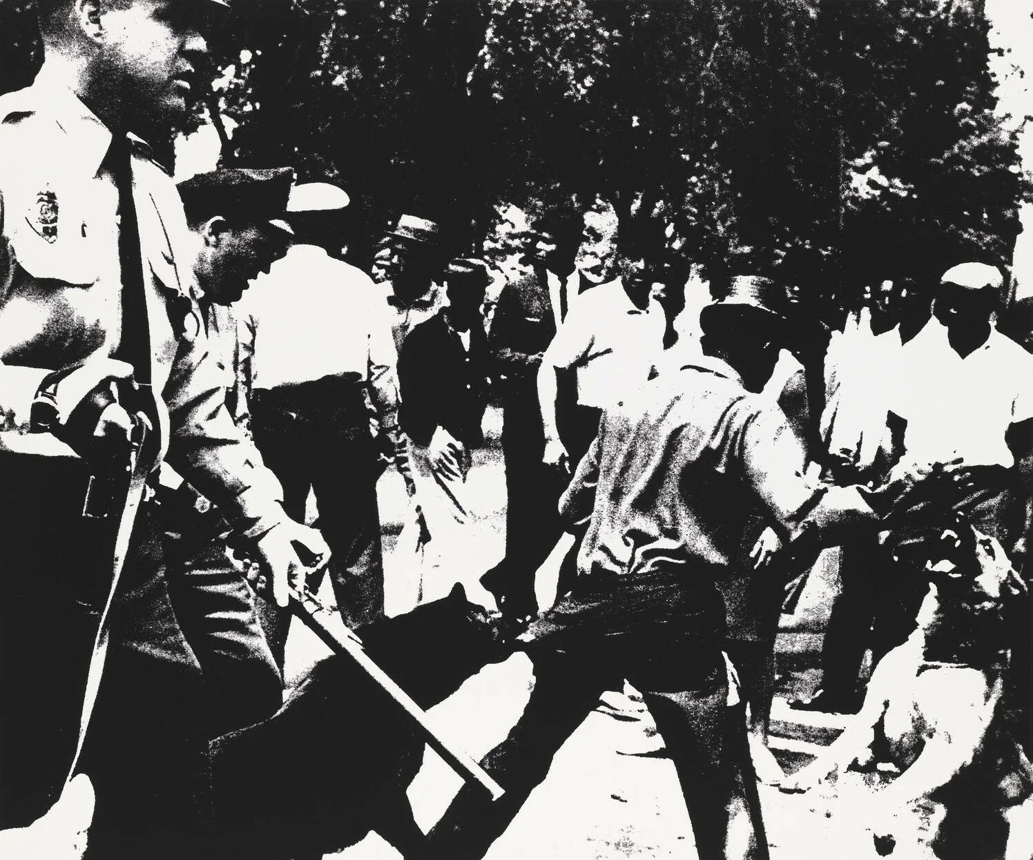Andy Warhol made very few alterations to the source material for this screenprint—a photograph from Life magazine (in fact, the photographer would later sue the artist for unauthorized use of his work). Warhol simply enlarged and reversed the original image, which was published in a May 1963 photo essay about police dogs attacking civil rights demonstrators in Birmingham, Alabama. Although several of Warhol’s series of the early 1960s touched on current events, the subject of Birmingham Race Riot (and thirteen related silkscreen paintings, made subsequently) is uncommonly political for him. Yet despite the photograph’s disturbing depiction of an African American man besieged by police dogs, Warhol’s deadpan presentation of the appropriated photograph makes the tone of his work ambiguous and difficult to gauge. - From Whitney Museum of American Art