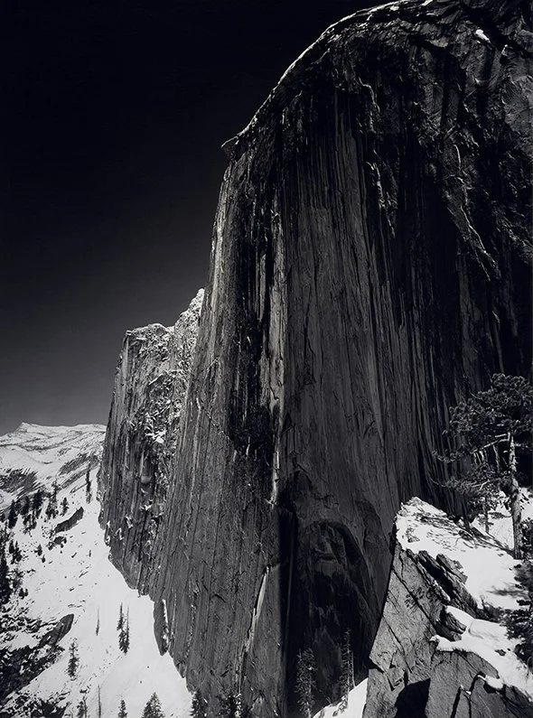 The negative for this image was the last one Adams made during a daylong trek with friends on April 17, 1927, and with the trip of the shutter he knew that he had caught something exceptional. In 1927, Adams made contact prints, the format of the negative determining the image size. Only later would he print it with an enlarger so that he could more fully convey Yosemite’s grandness, as in this print from 1979.